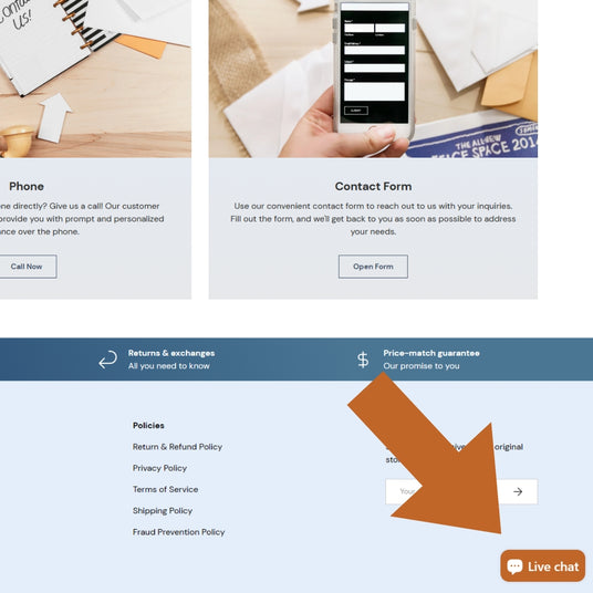 Getting live support is easy! To start chatting with one of our representatives, simply locate the "Live Chat" button at the bottom right corner of your screen. Click on the button, and a chat window will open, connecting you to our team instantly. Whether you have questions about our products, services, or your order, we're here to help in real-time. Look for the big arrow in the image pointing to the Live Chat button to get started right away.